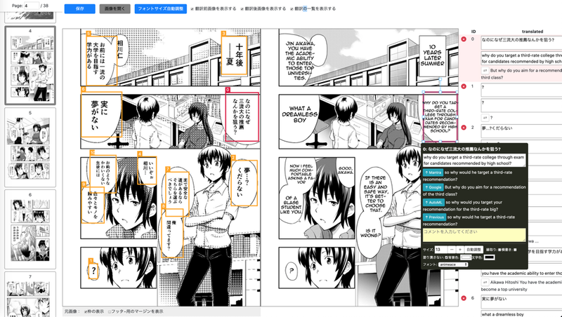 マンガの高速な多言語展開を可能にする法人向けサービス(2020年7月公開予定)です。手で描かれた特殊なフォント、独特な話し言葉、ストーリーの背景にある複雑な文脈など、マンガには翻訳を難しくする要素が多く含まれます。これらの問題を解決するため、創業者らは東京大学FoundX・IPA未踏アドバンスト事業・東大IPC等の支援を受け、世界最高精度(注)のマンガ機械翻訳技術(国際特許出願中)を開発しました。
