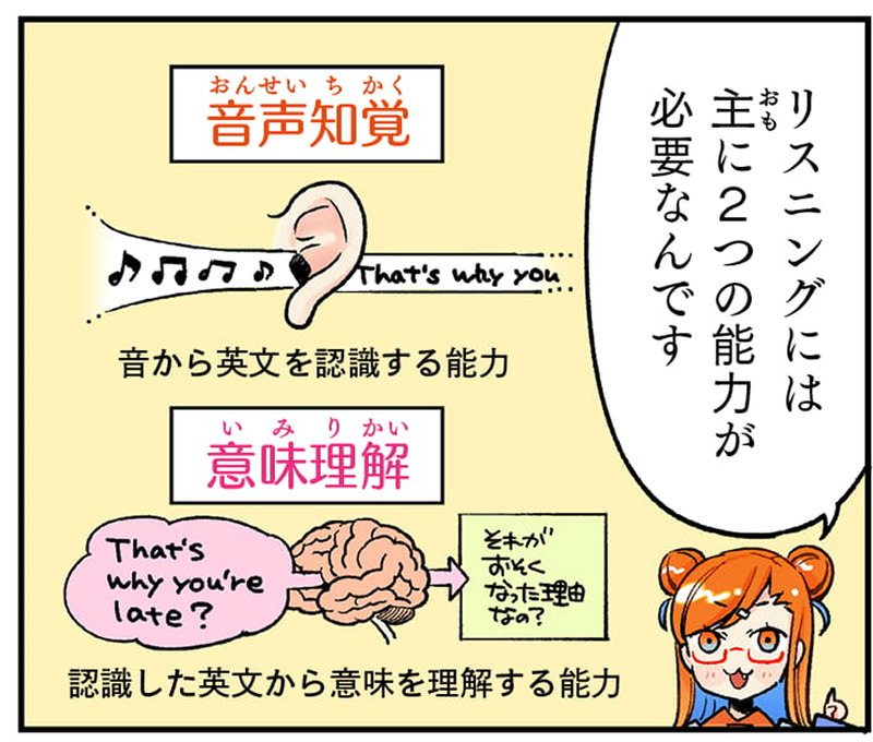 「リスニング」とは脳の中で、話している単語を聞き取る「音声知覚」と、聞き取れた単語を文章として理解する「意味理解」という2つのプロセスで構成されています。私たちはこれらの2つのプロセスを連続的に行い、リスニングをして「話している英語が理解できる」ようになります。