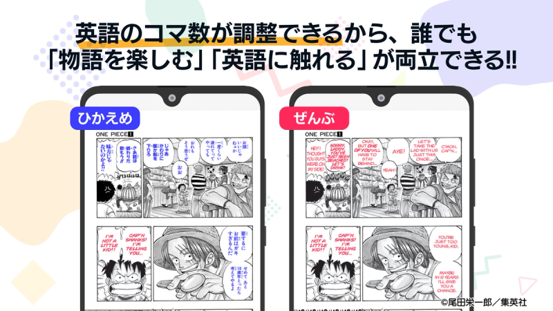 『Langaku』はコマごとの言語切替や、ページ内の英文量調整など、当社のAI技術を活用した学習サポート機能を多数搭載しています。こうした機能により、英語が得意でない方でも気軽に楽しんで多読学習に取り組んでいただけます。